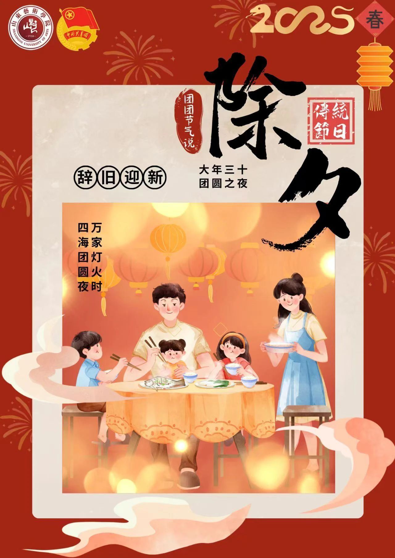 辞旧迎新张灯结彩除夕之夜满堂灯火旦逢良辰,顺颂时宜! 岁杪春临景星庆云万家灯火时和岁稔愿君岁喜安康、蛇年呈祥! 新春焕彩福运连年在新的一年祝你,祝我,祝我们巳巳如意、福禄穰穰! (海报:孙嘉、姚文玉 文字:李庆鑫 编辑:宋梦冉 审核:陈奕璇 责任编辑:赵敏 审核:王雯)