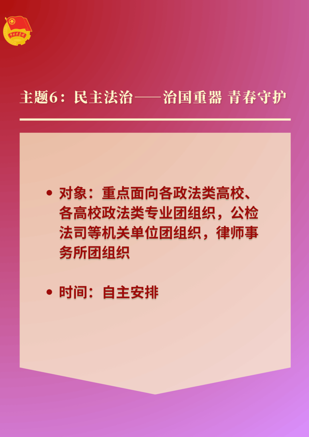 深入贯彻习近平总书记在同团中央新一届领导班子集体谈话时的重要讲话精神,巩固深化团员和青年主题教育成果,赋能基层团支部、激活“三会两制一课”,指导基层团组织紧扣党的中心任务,围绕党和国家重大战略,结合重要时间节点,分领域组织化开展主题团日,动员引领广大团员争当“五个模范”、做到“五个带头”,在强国建设、民族复兴伟业中勇当先锋队、突击队,为实现高质量发展持续注入青春力量。