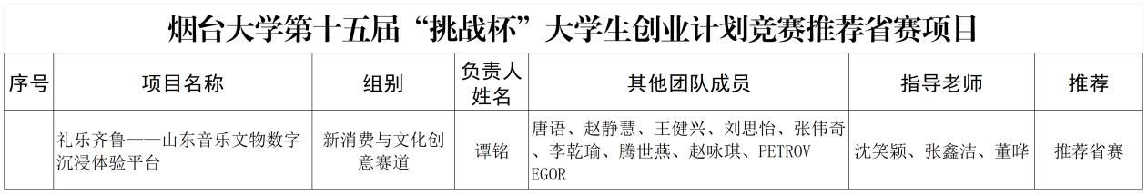 按照第十五届“挑战杯”山东省大学生创业计划竞赛的赛制,对于跨校参赛的相关要求,我校城市艺术与创意学院赵静慧(学号202411001)参加烟台大学拟推报省赛的“礼乐齐鲁——山东音乐文物数字沉浸体验平台”项目,现予以公示。