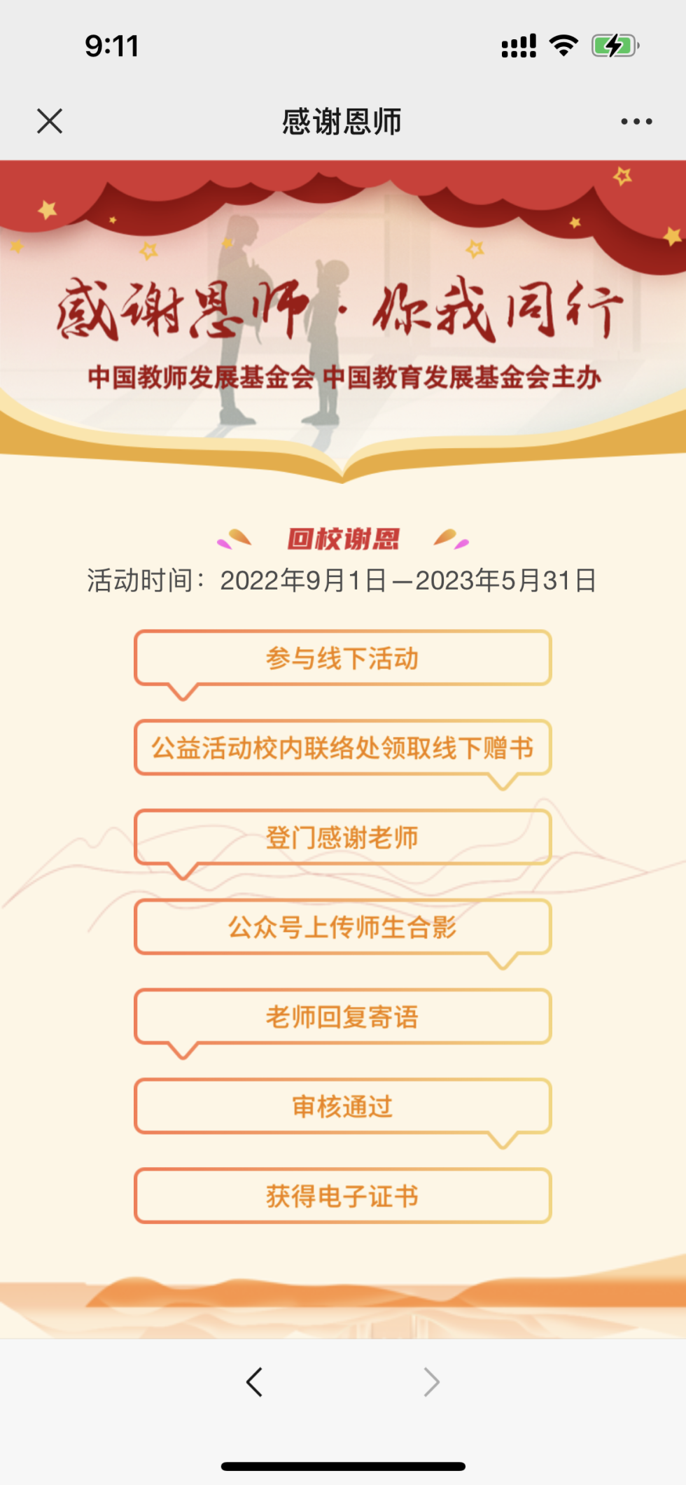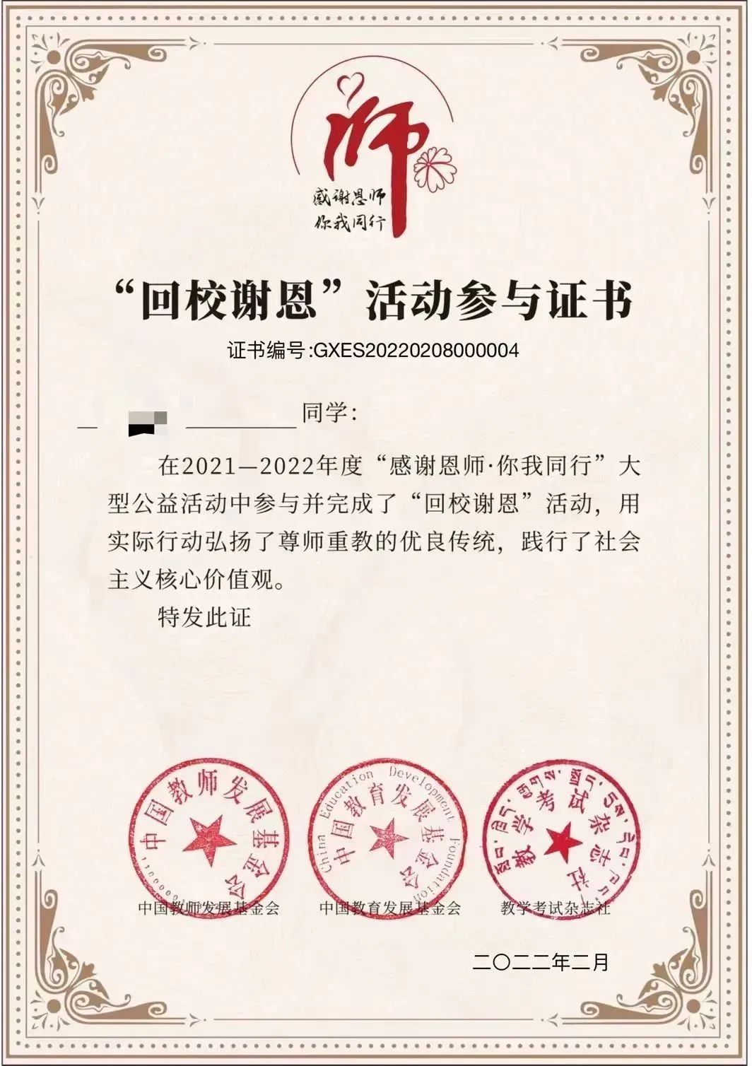 4、所有参与并完成公益活动的学生均可获得带有唯一编码,由中国教师发展基金会、中国教育发展基金会和教学考试杂志社盖章的电子公益证书一份,并可通过微信服务号查询、下载、打印。同时,根据上传照片的质量(包括清晰度、跟老师的互动、表情,创意等),会进行择优评选,颁发优秀感恩大使奖。