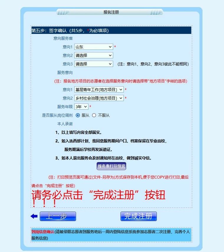 2023年西部计划山东项目报名系统统一并入全国项目报名系统,报名山东项目志愿者,请在“签字确认”环节,在意向服务省选择“山东”,服务意向选择带“地方项目”字样的选项,具体参照以下报名方式: