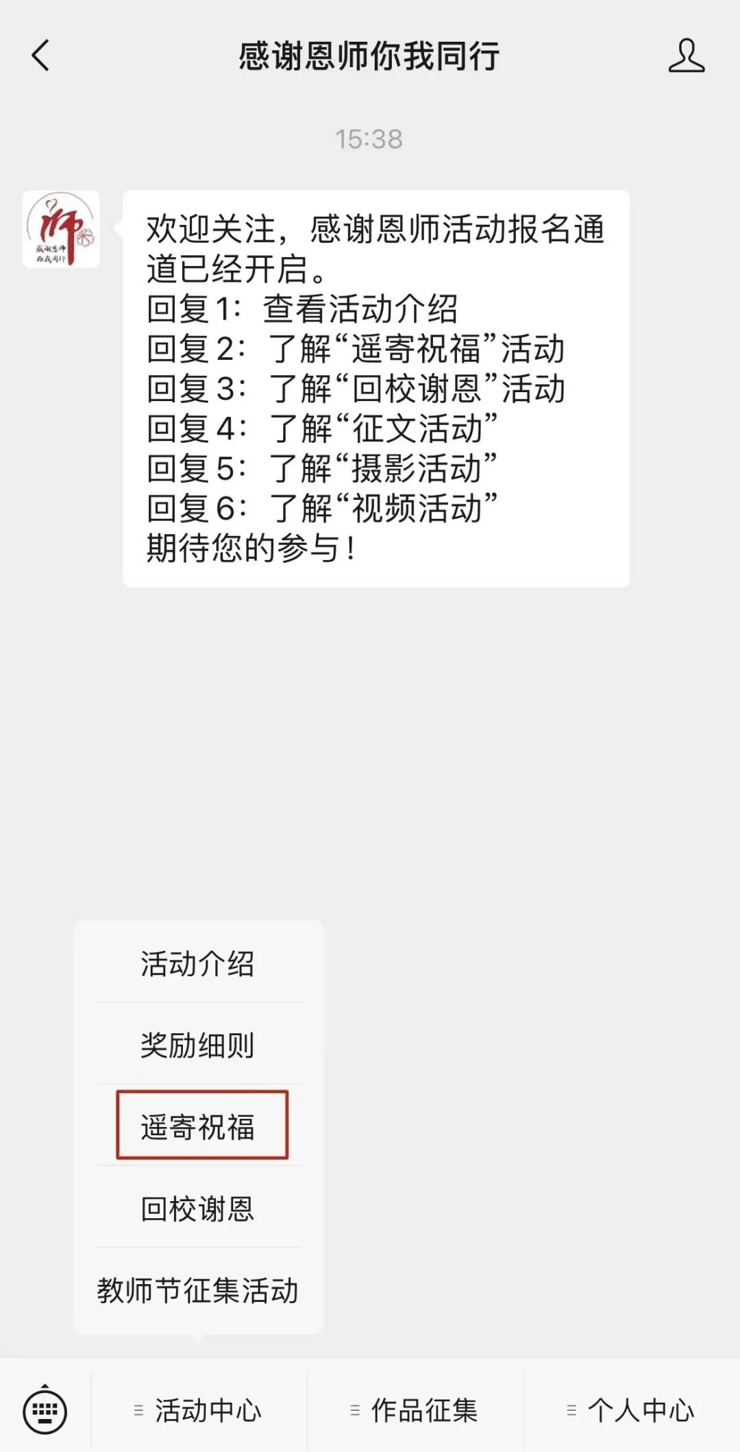 学生通过征文、摄影、视频等形式抒发对“遥寄祝福,回校谢恩”活动的感悟,完成后将作品按要求上传指定邮箱,具体流程可点击阅读原文观看。