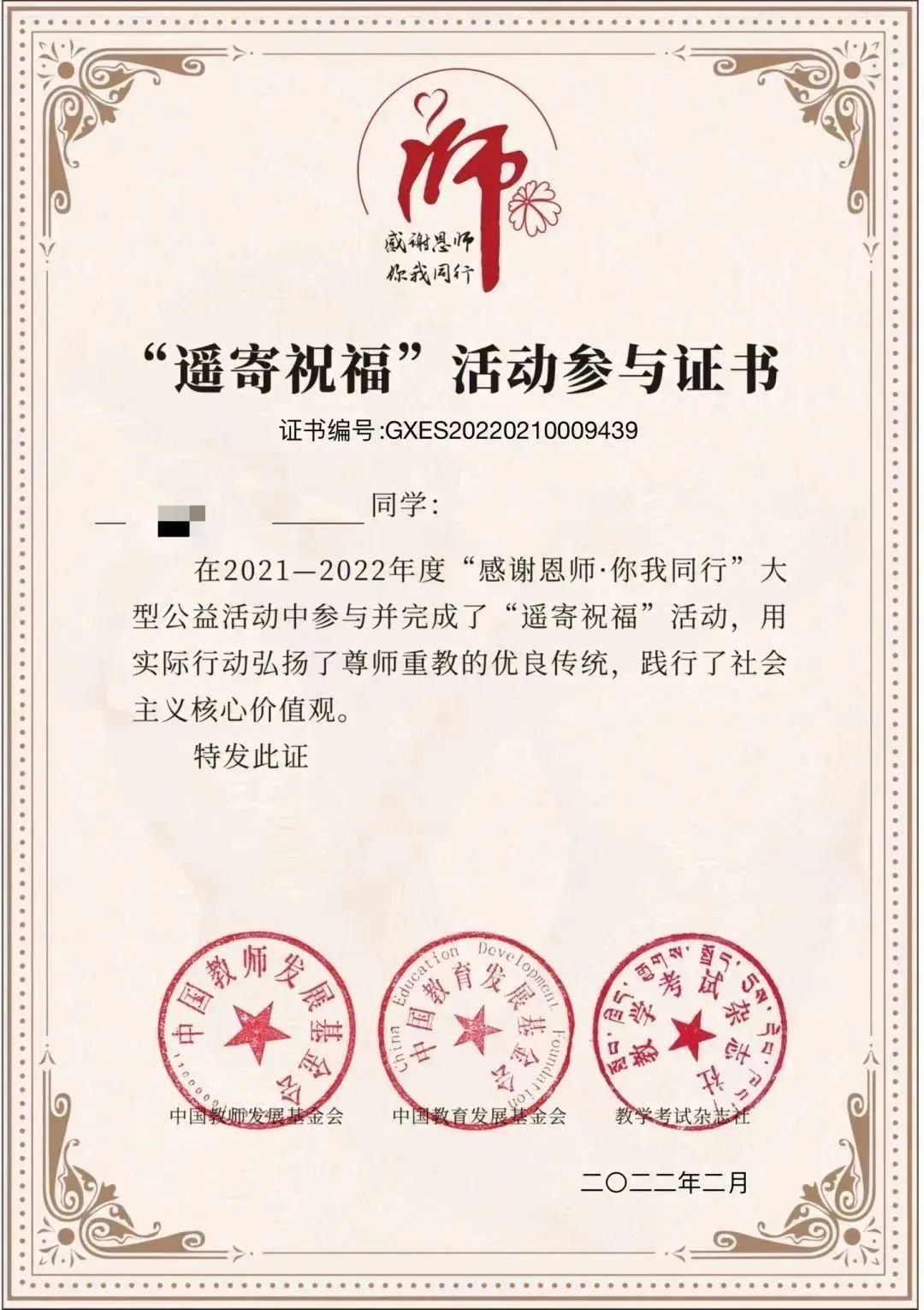 6、所有参与并完成公益活动的学生均可获得带有唯一编码,由中国教师发展基金会、中国教育发展基金会和教学考试杂志社盖章的电子公益证书一份,并可通过微信服务号查询、下载、打印。