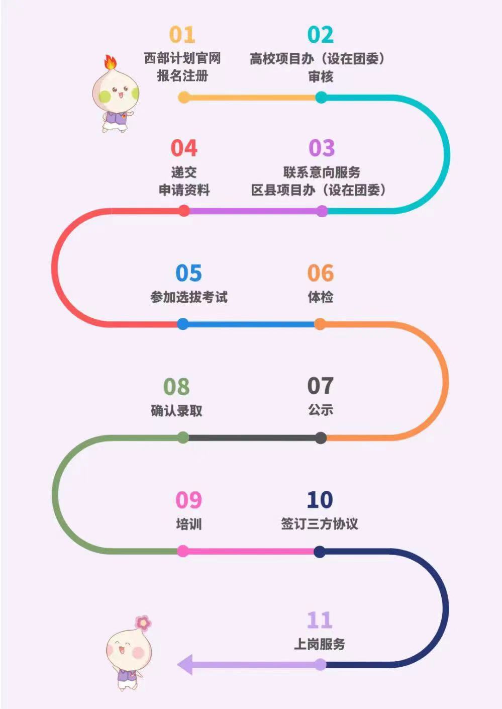 西部计划官网报名系统注册报名→高校项目办(设在团委)审核→联系意向服务区县项目办(设在团委)→递交申请资料→参加选拔考试→体检→公示→确认录取→培训→签订三方协议→上岗服务