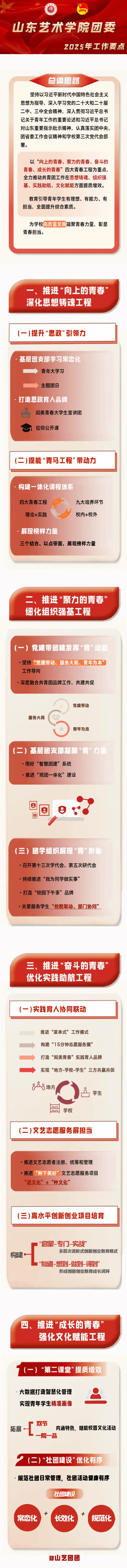 会上,王雯传达学习团省委年度工作会议精神和学校相关工作要求,解读了《山东艺术学院团委2025年工作要点》,系统部署全年重点任务。她强调,要聚焦团省委和学校中心工作,持续深化党建带团建工作机制,以“信仰公开课”、“青马工程”体系建设为抓手,做优思想引领“软实力”,以“我为同学办实事”、志愿服务、社会实践项目为依托,做强第二课堂“硬支撑”,切实推动学校共青团工作提质增效。 下一步,校团委将认真贯彻党的二十大和二十届二中、三中全会精神,落实习近平总书记在全国教育大会上的重要讲话精神、关于青年工作的重要思想和全面从严治团要求,持续深化团学改革,紧紧围绕“四大青春”工程,扎实开展各项常规工作,着力推进创新创业教育提质、实践育人品牌升级,为学校的高质量发展贡献青春动能、汇聚青春力量。 会议期间,传达了关于做好2025年西部计划招募宣传工作的会议精神及内容。