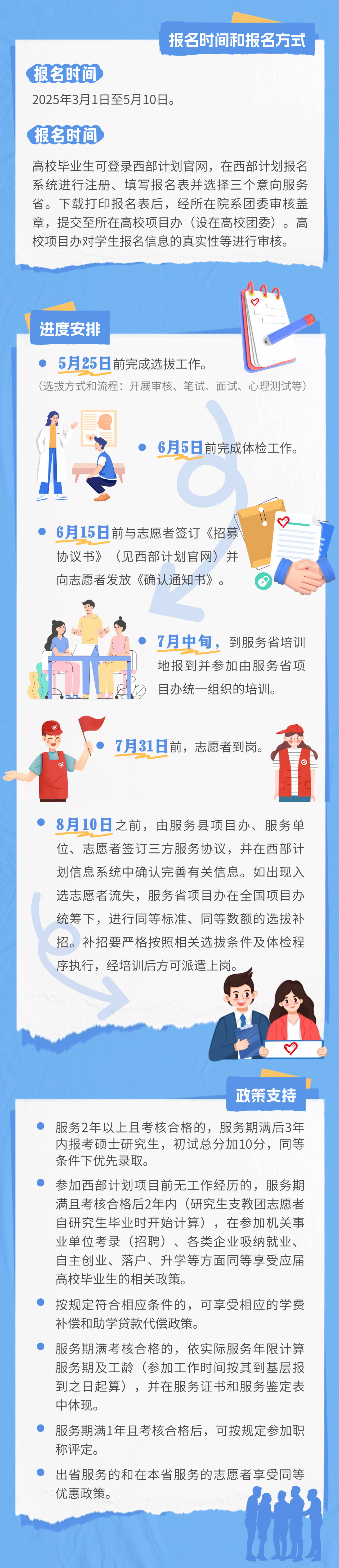 3月1日至5月10日,2025年普通高等学校应届毕业生或在读研究生,可通过微信公众号“西部志愿汇”(菜单栏中的“我要报名”)或登录西部计划官方网站(http://xibu.youth.cn),在西部计划报名系统中注册报名。