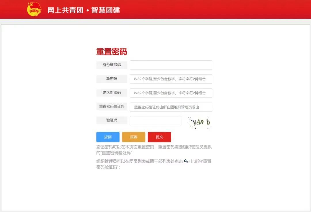 首次登录会提示修改密码。若遗忘密码:在登录页面点击「忘记密码」,并联系原团支部管理员生成「重置密码验证码」,随后填写下图内容提交,即可重新找回密码。
