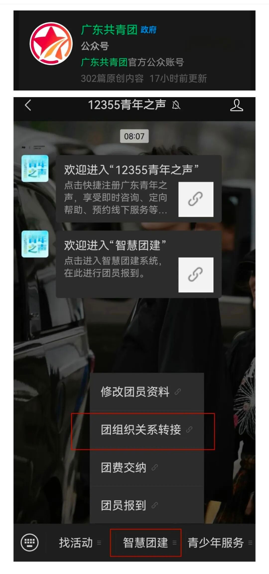 “广东共青团”/“12355 青年之声”-“智慧团建”-“团组织关系转接”