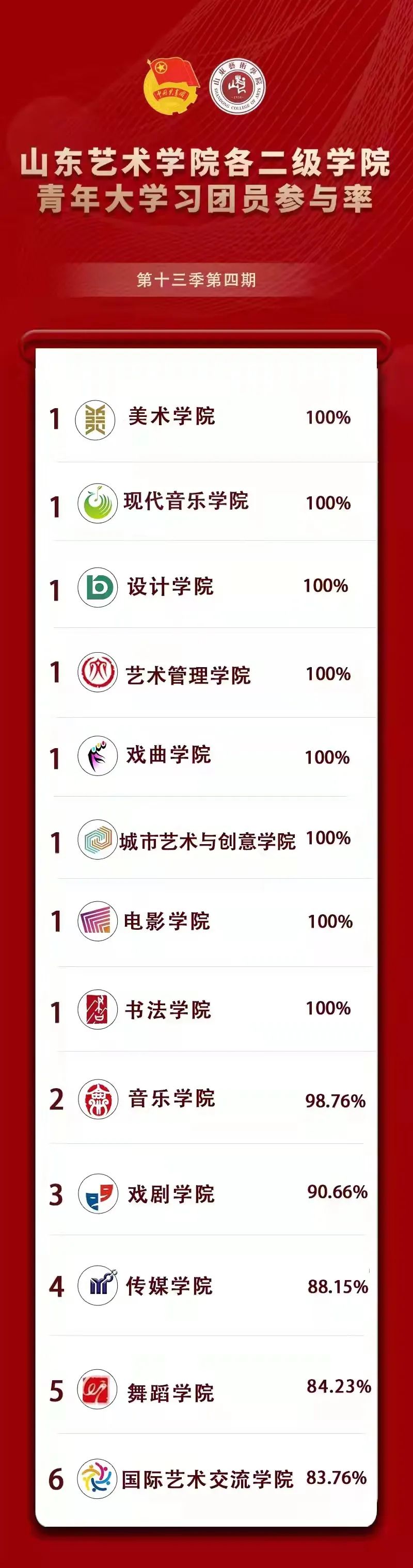 下面让我们看看【山东艺术学院各二级学院青年大学习团员参与率】吧!