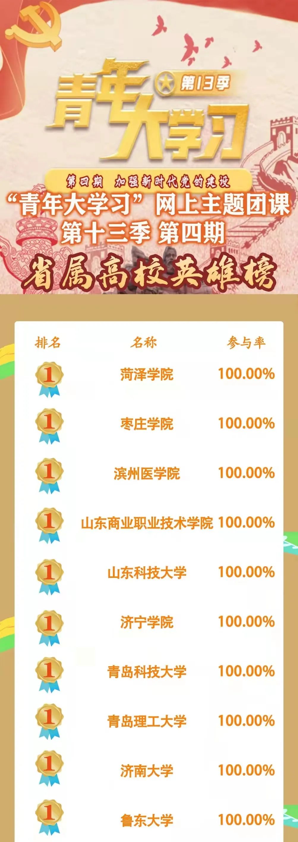 现在让我们一起来看看上一期青年大学习的学习情况吧~在第十三季“青年大学习”第四期网上团课学习中,我校参学率与其他26所省属高校均达到100%,为所有参与学习的团组织、团员青年手动点赞。