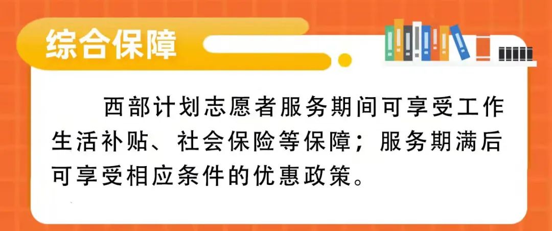 西部计划志愿者服务期间可享受工作生活补贴、社会保险等保障;服务期满后可享受相应条件的优惠政策。