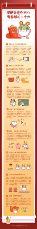 为迎接和学习宣传贯彻党的二十大,庆祝建团100周年,加强对团员的思想政治教育,引导动员广大团员坚定跟党走、建功新时代,发挥先锋模范作用,在新时代社会主义现代化强省建设新征程中贡献青春力量,共青团山东省委决定开展“砥砺奋进守初心 青春献礼二十大”团员教育“八个一”系列工作,“一图读懂”带您了解。