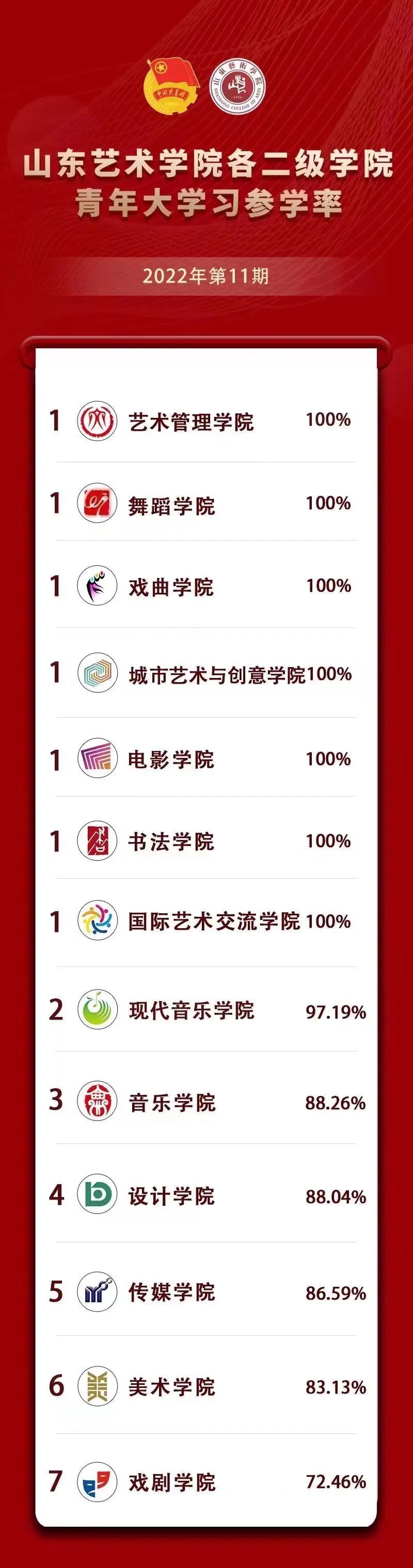在2022年第11期中,艺术管理学院、舞蹈学院、戏曲学院、城市艺术与创意学院、电影学院、书法学院、国际艺术交流学院参学率达到了100%,对上述7个学院提出表扬,希望不断总结经验,持续发力,保持良好态势。