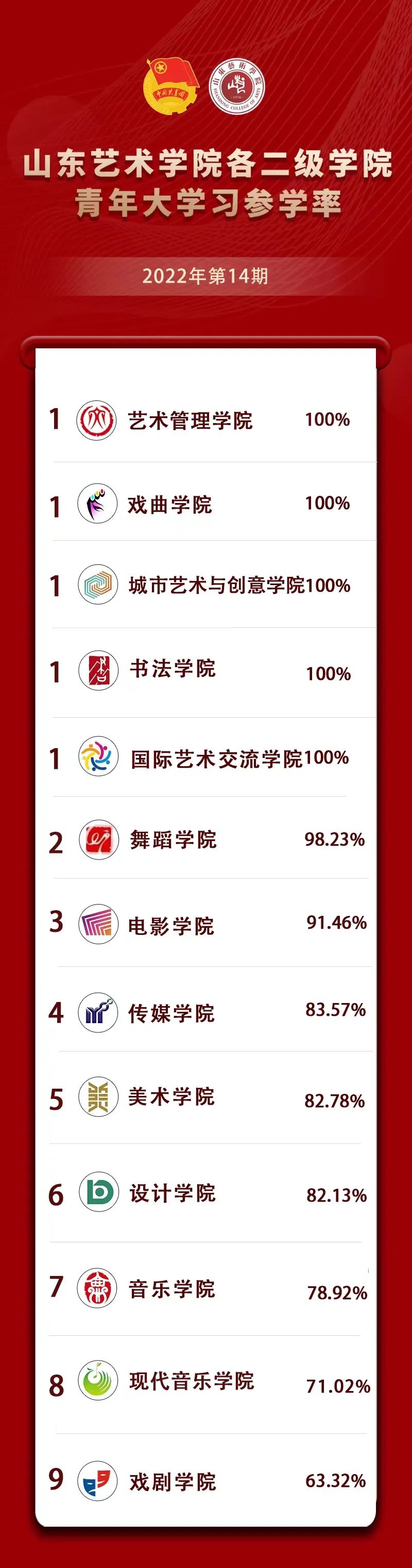 在2022年第14期中,艺术管理学院、戏曲学院、城市艺术与创意学院、书法学院、国际艺术交流学院参学率达到了100%,对上述5个学院提出表扬,希望不断总结经验,持续发力,保持良好态势。 设计学院、传媒学院较上期有所上升,希望继续努力,力争做到100%参学,舞蹈学院、电影学院、美术学院、音乐学院较上期有所下降,音乐学院、现代音乐学院、戏剧学院参学率较低,希望以上6个学院在以后的学习中,加大督促力度,积极动员更多团员青年参与学习。