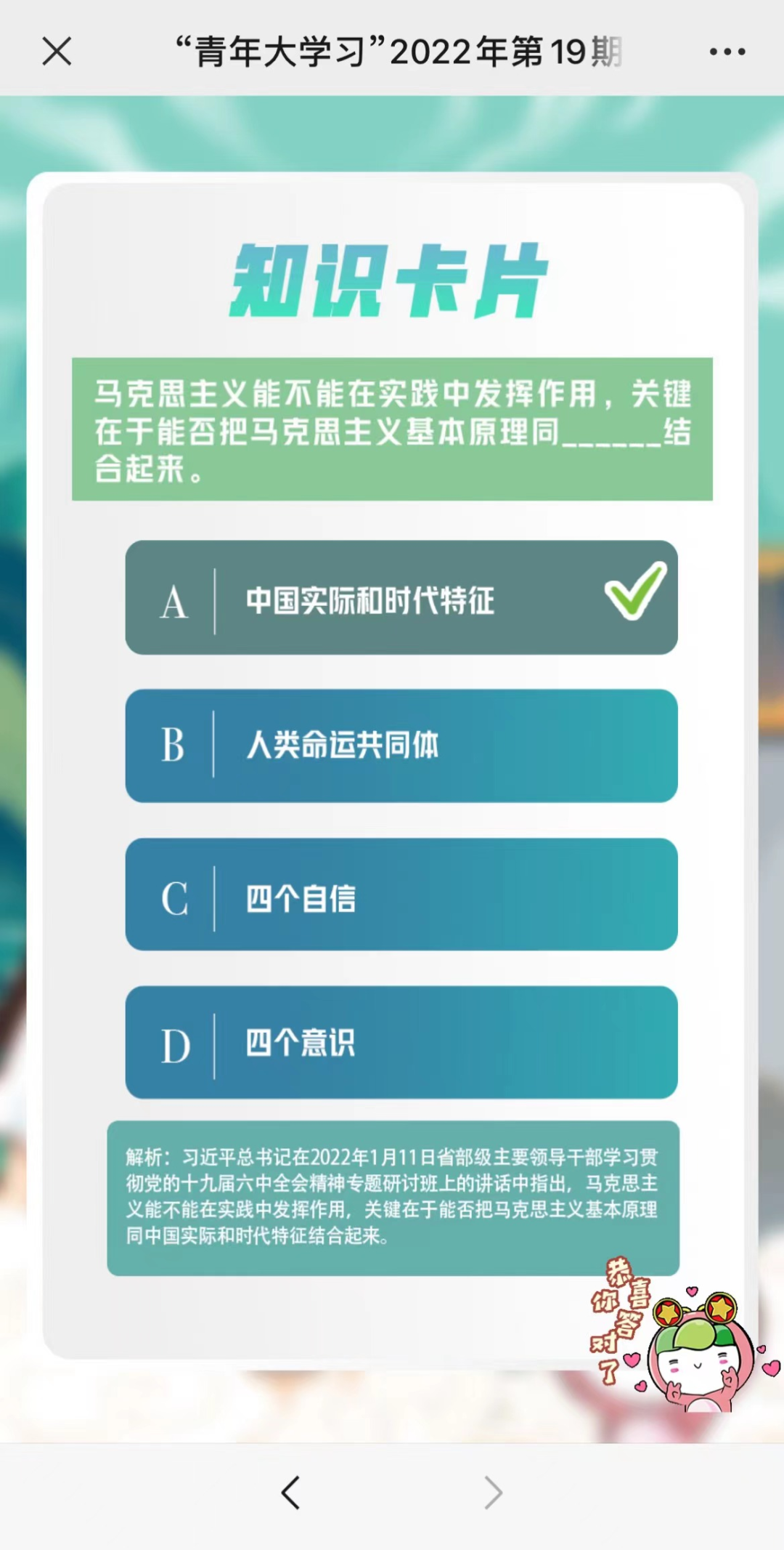 系统会显示【恭喜你!完成2022年第19期的学习】别忘了完成课后习题哦