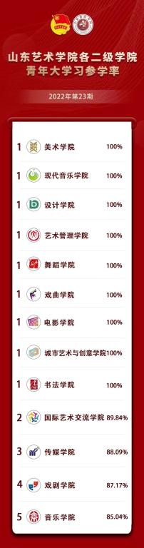 在2022年第23期中,美术学院、现代音乐学院、设计学院、艺术管理学院、舞蹈学院、戏曲学院、电影学院、城市艺术与创意学院、书法学院参学率达到了100%,对上述九个学院提出表扬,希望不断总结经验,持续发力,保持良好态势。