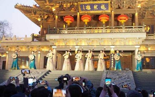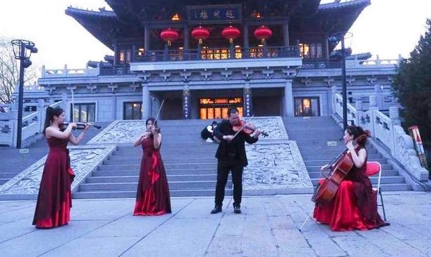 音乐学院同学们组成的“学雷锋文艺志愿服务队”在超然楼亮灯前,以弦乐四重奏莫扎特《弦乐小夜曲》和《玛依拉》拉开序幕,婉转优美的旋律立刻吸引来周围的游客驻足。6点20分,超然楼亮起明亮璀璨的灯光。在悦耳动听的琵琶声中,山东艺术学院女子弹拨乐团的同学们从楼内翩然走出,在楼前平台演奏了一首传统名曲《春江花月夜》,清脆悠扬的乐声,令现场观众听得如痴如醉。