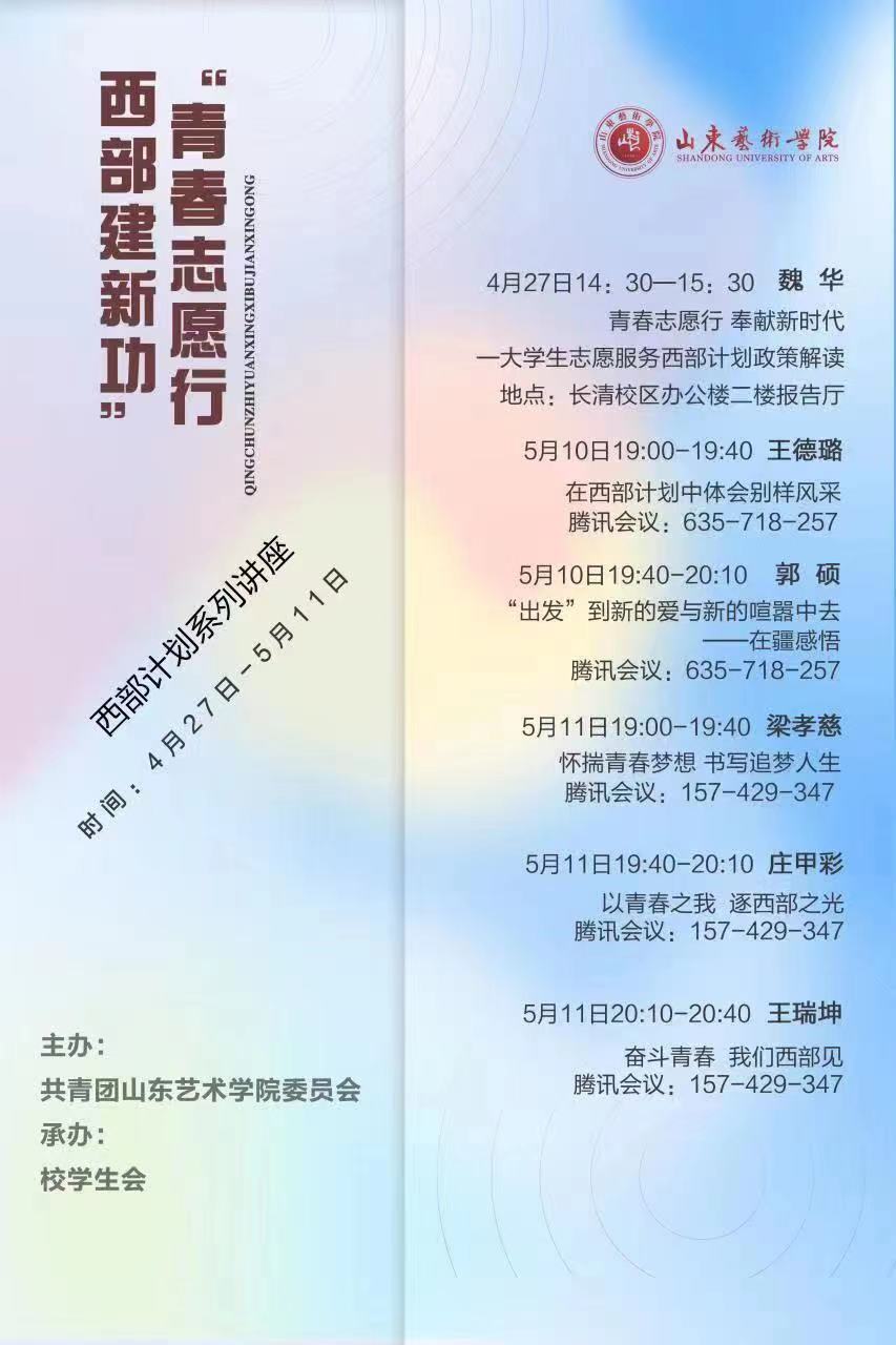 立大志,踔厉奋发奉献青春;深扎根,奋勇前行彰显担当。以青春之名,赴志愿之约,让青春绽放在祖国和人民最需要的地方。“青春志愿行,西部建新功”系列讲座我们不见不散!