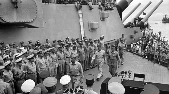停泊于东京湾的美国战列舰“密苏里”号上举行向同盟国投降的签降仪式