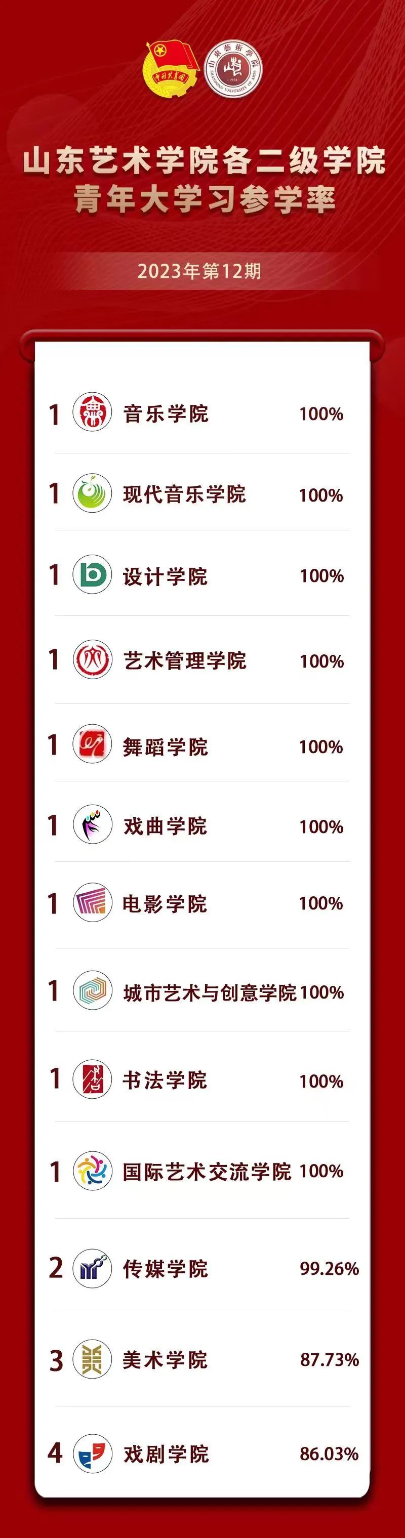 在2023年第12期中,音乐学院、现代音乐学院、设计学院、艺术管理学院、舞蹈学院、戏曲学院、电影学院、城市艺术与创意学院、书法学院、国际艺术交流学院参学率达到了100%,对上述学院提出表扬,希望不断总结经验,持续发力,保持良好态势。