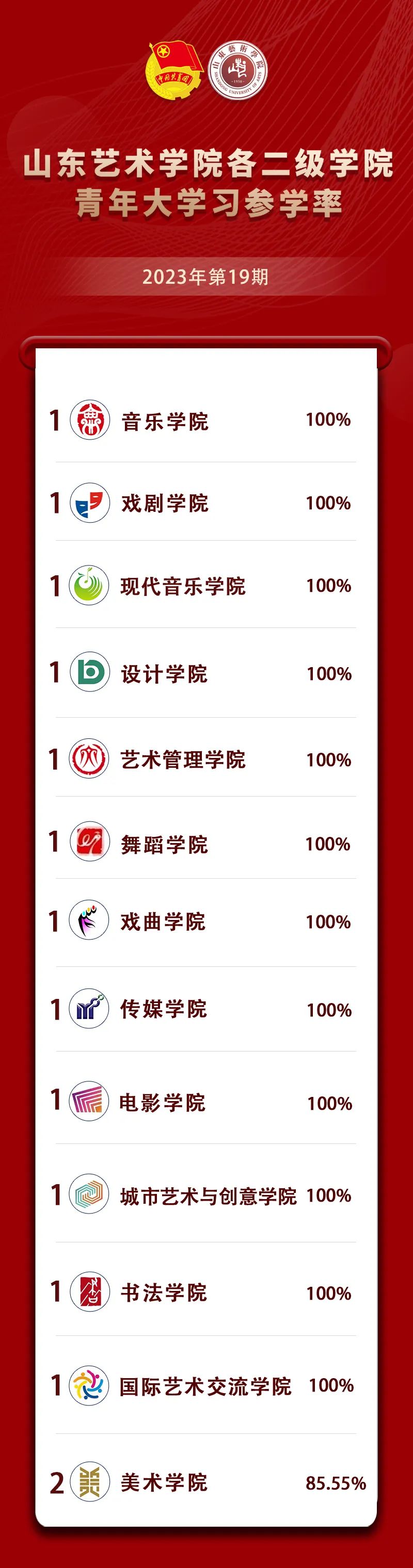 在2023年第19期中,音乐学院、戏剧学院、现代音乐学院、设计学院、艺术管理学院、舞蹈学院、戏曲学院、传媒学院、电影学院、城市艺术与创意学院、书法学院、国际艺术交流学院参学率达到了100%,对此提出表扬,希望不断总结经验,持续发力,保持良好态势。