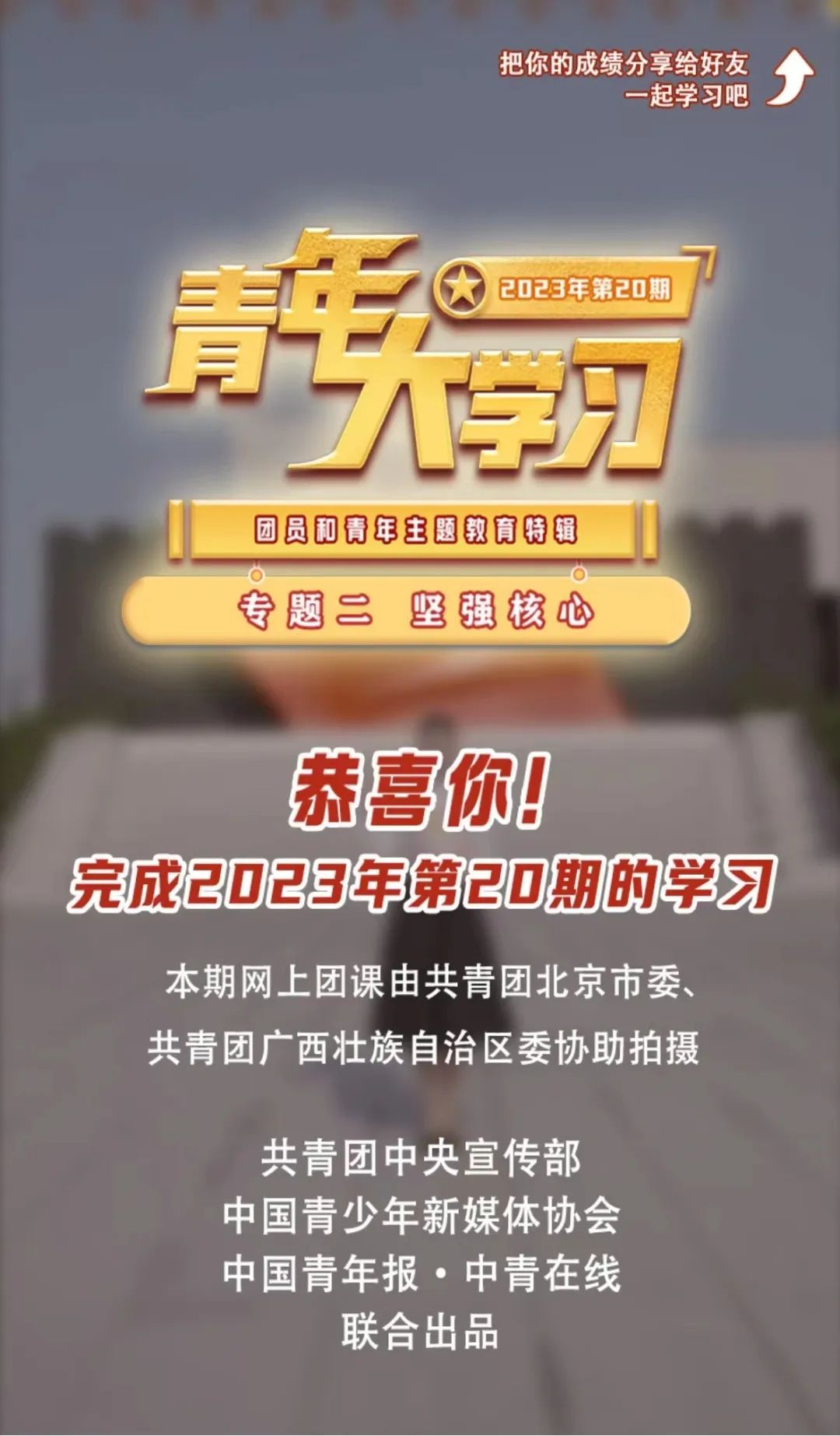 完成全部学习内容,系统会显示【恭喜你!完成2023年第20期的学习】别忘了完成课后习题哦