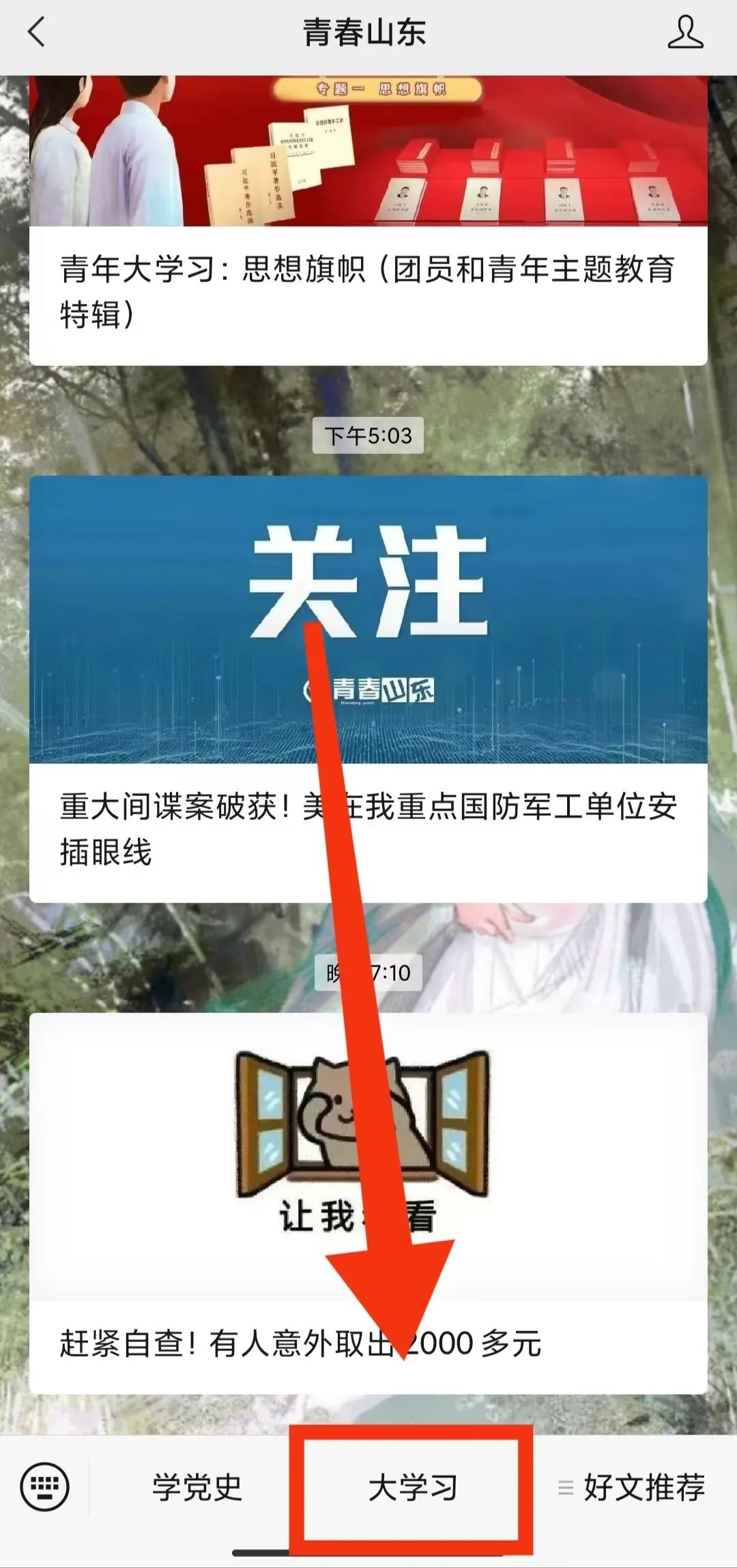 菜单栏点击“中间区域”-“大学习”
