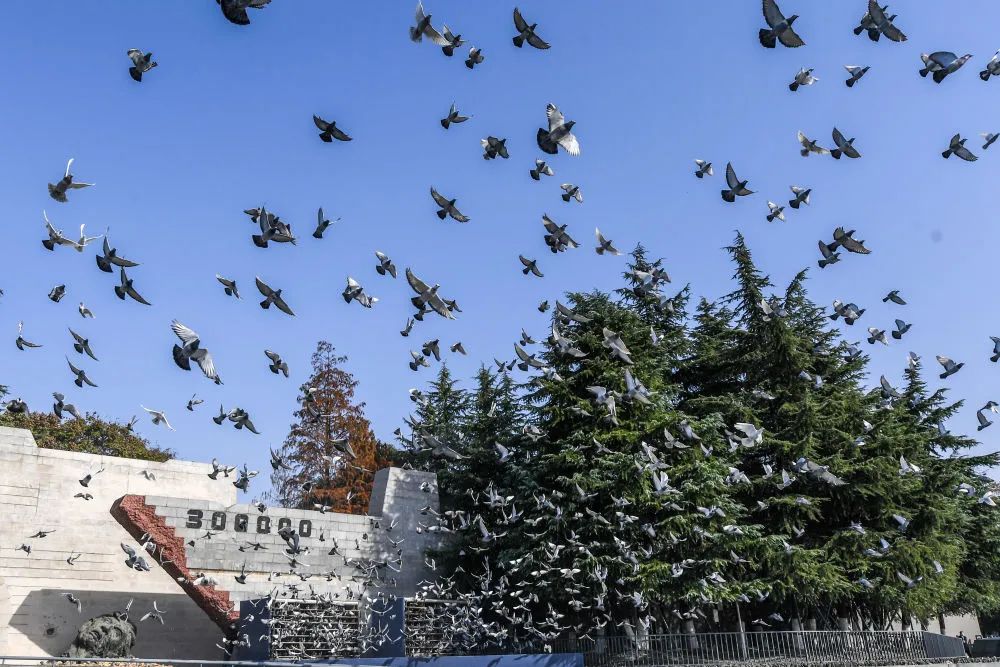 2022年12月13日,南京大屠杀死难者国家公祭仪式现场放飞和平鸽。新华社记者李博 摄