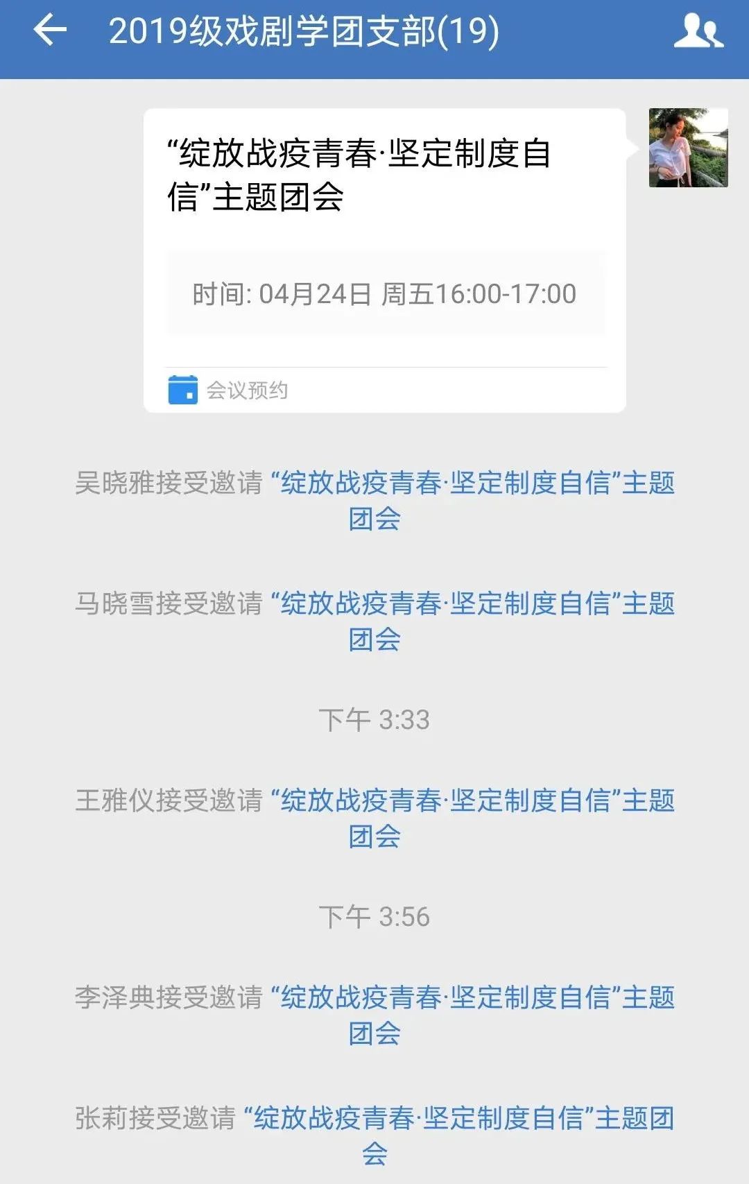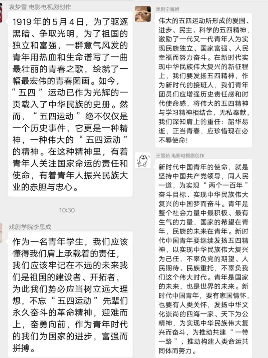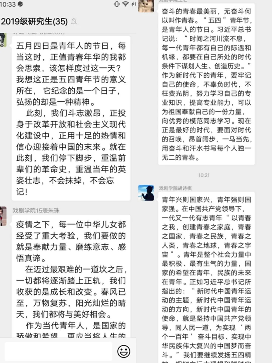 由于近期疫情影响,戏剧学院积极响应共青团中央号召,开展五四青年节“绽放战疫青春·坚定制度自信”线上主题宣传教育活动,通过学习战疫故事,感悟革命精神,激发广大青年自强不息、甘于奉献的意志品质;组织团员青年收看共青团中央举办的“让青春为祖国绽放”网上主题团日活动,激励广大团员青年树立与时代主题同心同向的理想信念,用实际行动践行“五四精神”。