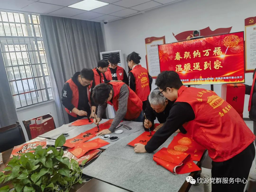 无联不成春,有联春更浓。为进一步弘扬传统文化,营造文明、欢乐、祥和的节日气氛,丰富社区居民的精神文化生活。近日,山艺书法学院志愿宣讲团走进崮云湖街道欣源社区,开展了“笔墨书香送祝福”写春联送福字暨党史宣讲活动。