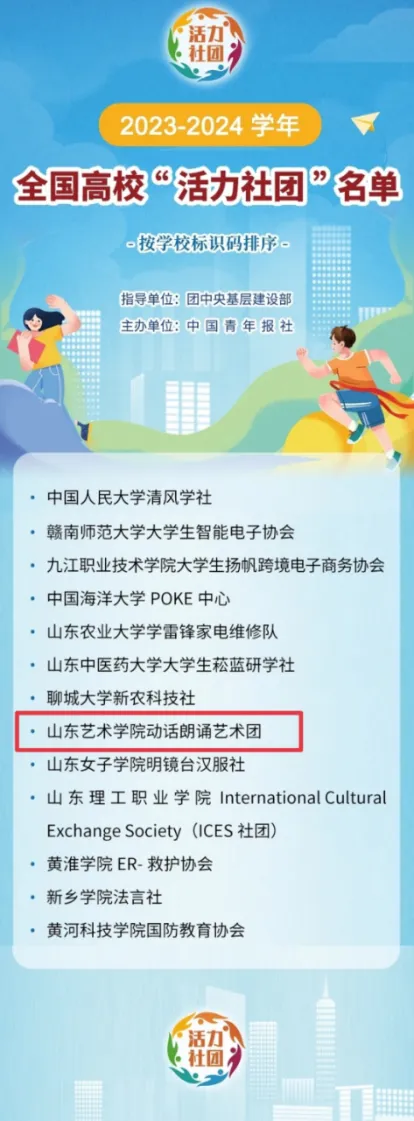 近日,由团中央基层建设部指导中国青年报社开展2023-2024学年高校“活力社团”风采展示活动落下帷幕,经校内选树、省级展示、全国展示等环节,我校动话朗诵艺术团在本次“活力社团”风采展示中脱颖而出,成功入选2023-2024学年全国高校“活力社团”!