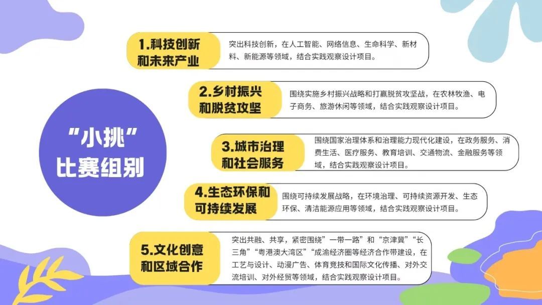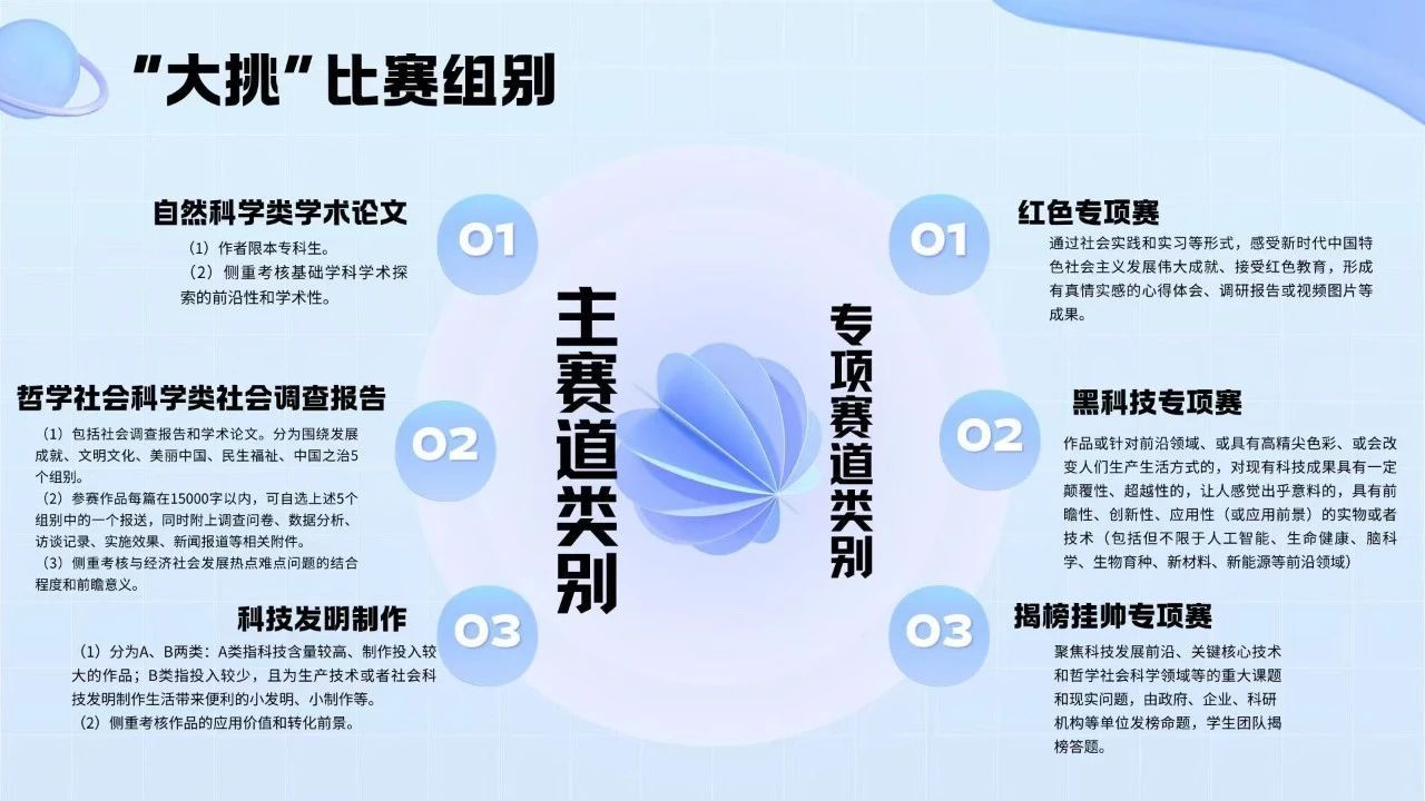 “挑战杯”中国大学生创业计划竞赛起源于美国,又称商业计划竞赛,是风靡全球高校的重要赛事。它借用风险投资的运作模式,要求参赛者组成优势互补的竞赛小组,提出一项具有市场前景的技术、产品或者服务,并围绕这一技术、产品或服务,以获得风险投资为目的,完成一份完整、具体、深入的创业计划。根据参赛对象,分普通高校、职业院校两类。设科技创新和未来产业、乡村振兴和脱贫攻坚、城市治理和社会服务、生态环保和可持续发展、文化创意和区域合作五个组别。
