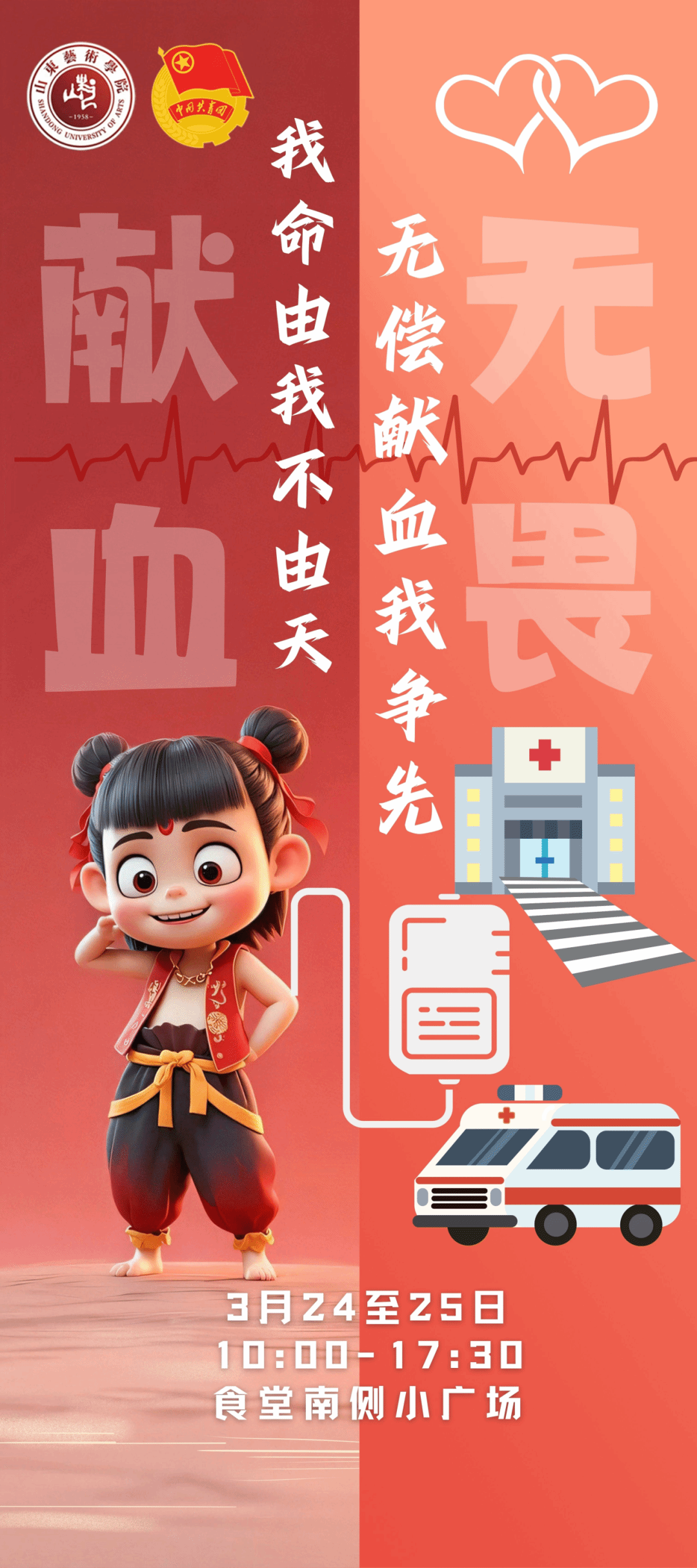 “凡人的血,也能让我这条命多撑一会!”电影《哪吒之魔童降世》中的这句台词,曾让无数观众为之动容。而在春意融融的艺苑,一场以“哪吒”为名、汇聚爱心的献血活动,同样温暖人心,诠释着希望与爱的力量。3月24日-25日,由校青年志愿者协会承办的“哪吒掌心聚热血,雷锋精神化长虹”献血活动在食堂南侧小广场圆满落下帷幕,山艺er们用奉献和赤诚绘就了一幅幅昂扬的春日生命长卷。