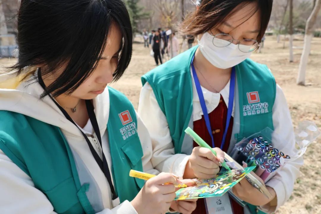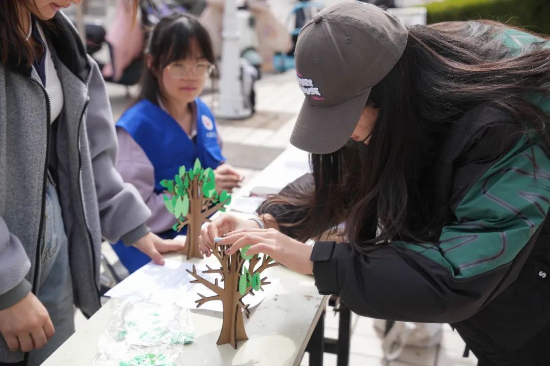 艺术在树牌创作中熠熠生辉。同学们以透明亚克力板为画布,用水彩笔绘制出萌趣树精灵、抽象色块画、书法诗句等创意作品。这些独一无二的树牌不仅为小树发放1周岁“身份证”,更成为春日校园里跃动的艺术符号。