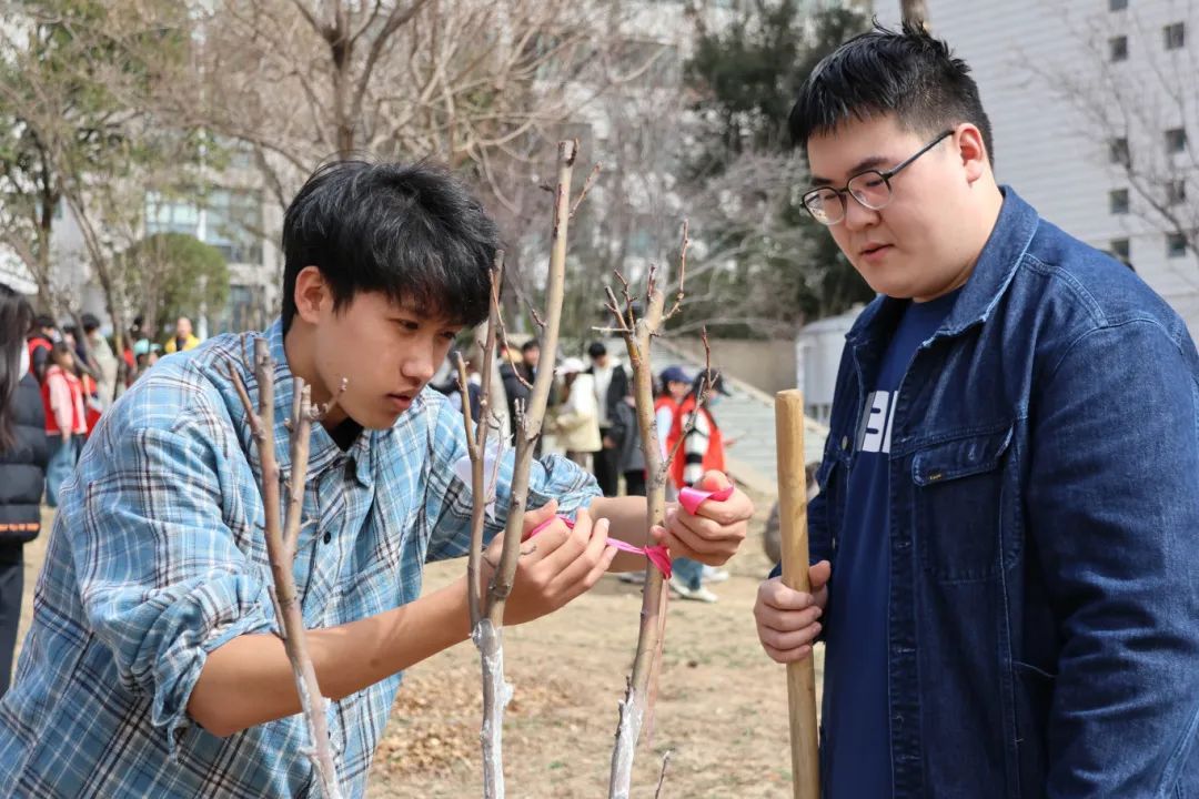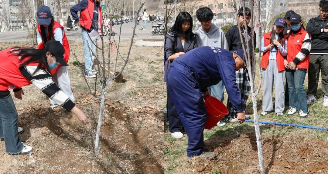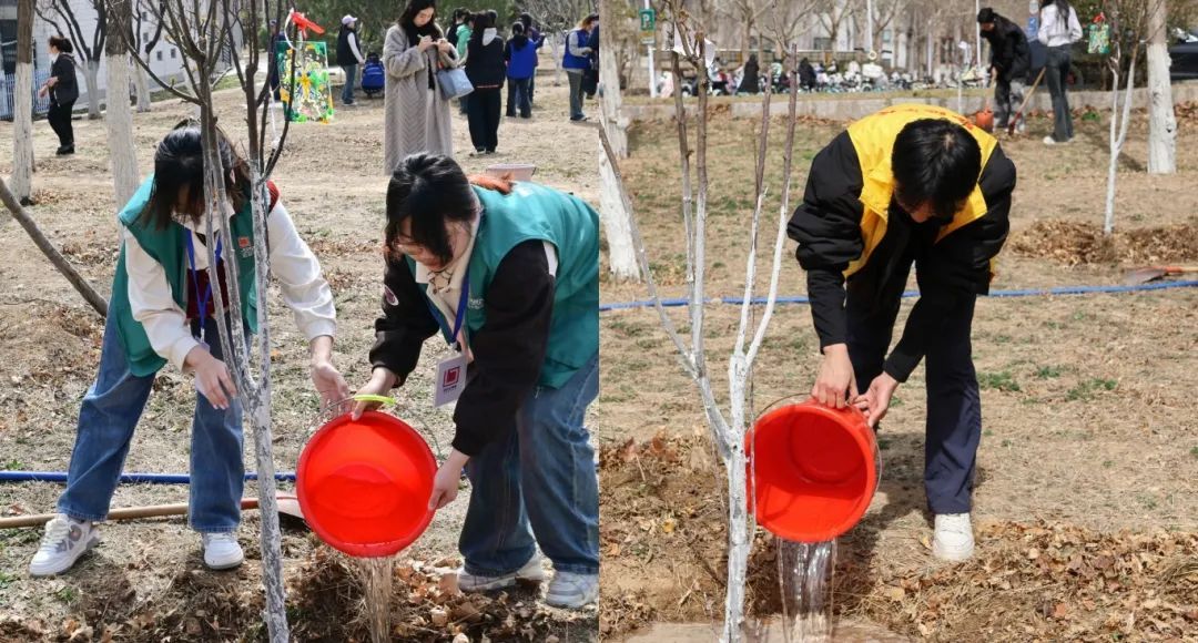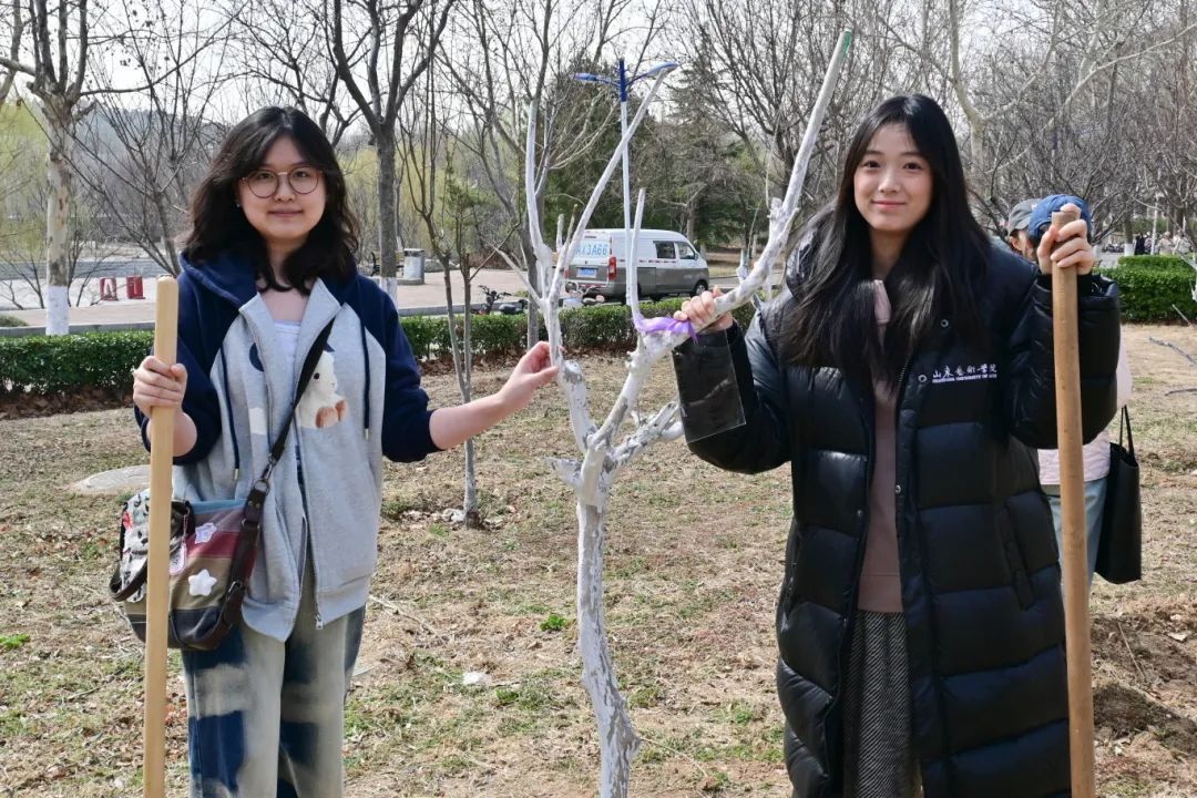 活动现场,同学们挥锹培土、提水浇灌、施肥养护小海棠。泥土的芬芳与青春的笑语交织,每一铲土、每一滴水、每一份肥料见证着山艺人年复一年的绿色传承。