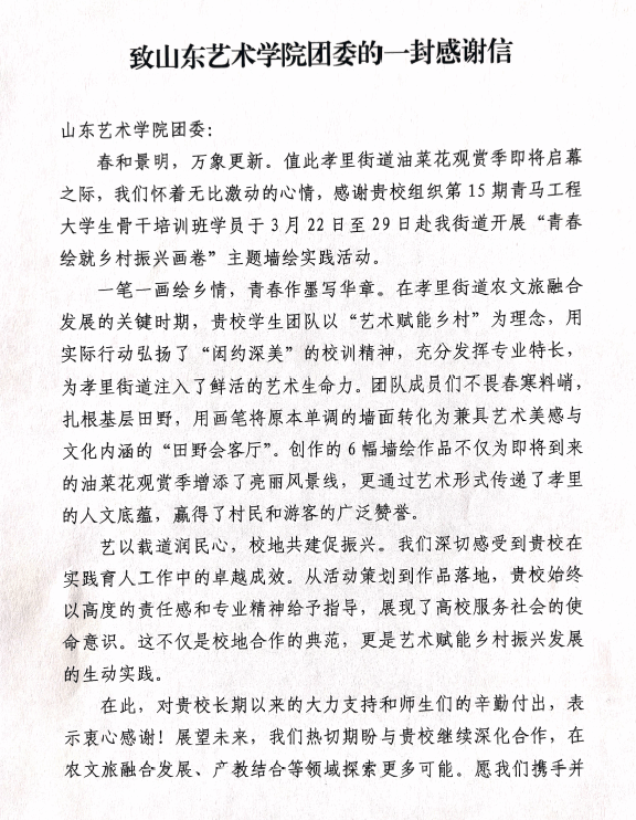 此次活动不仅为孝里街道油菜花景区带来了新的文化景观,提升了乡村旅游的吸引力,更彰显出山艺学子投身乡村振兴事业的坚定决心与责任担当。未来,山东艺术学院将继续发挥专业优势,组织开展更多形式多样的社会实践活动,探索创新模式,为乡村文化建设与旅游发展贡献更多青春智慧,共同绘就乡村振兴的美好蓝图。