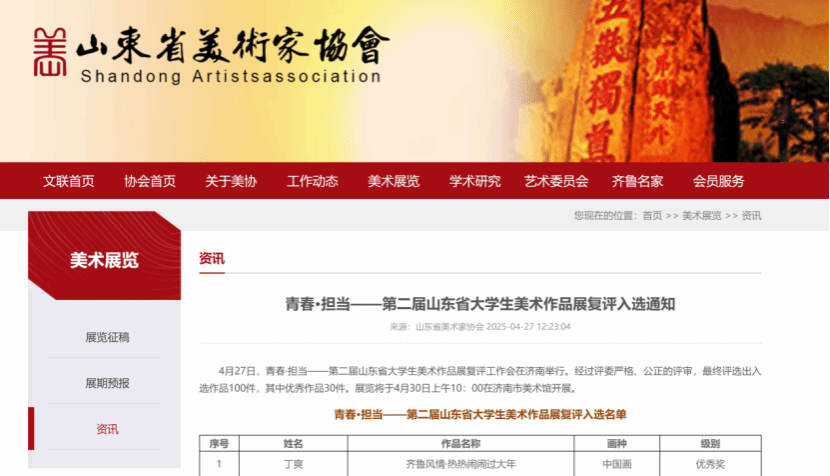 近日,由共青团山东省委、山东省文学艺术界联合会、山东省青年联合会、济南市文化和旅游局主办,山东省美术家协会、山东省青年美术家协会、济南市美术馆(济南画院)承办的“青春·担当——第二届山东省大学生美术作品展”复评工作顺利结束。最终评选出入选作品100件,其中优秀作品30件。我校共有25件作品成功入选,其中9件作品获优秀奖