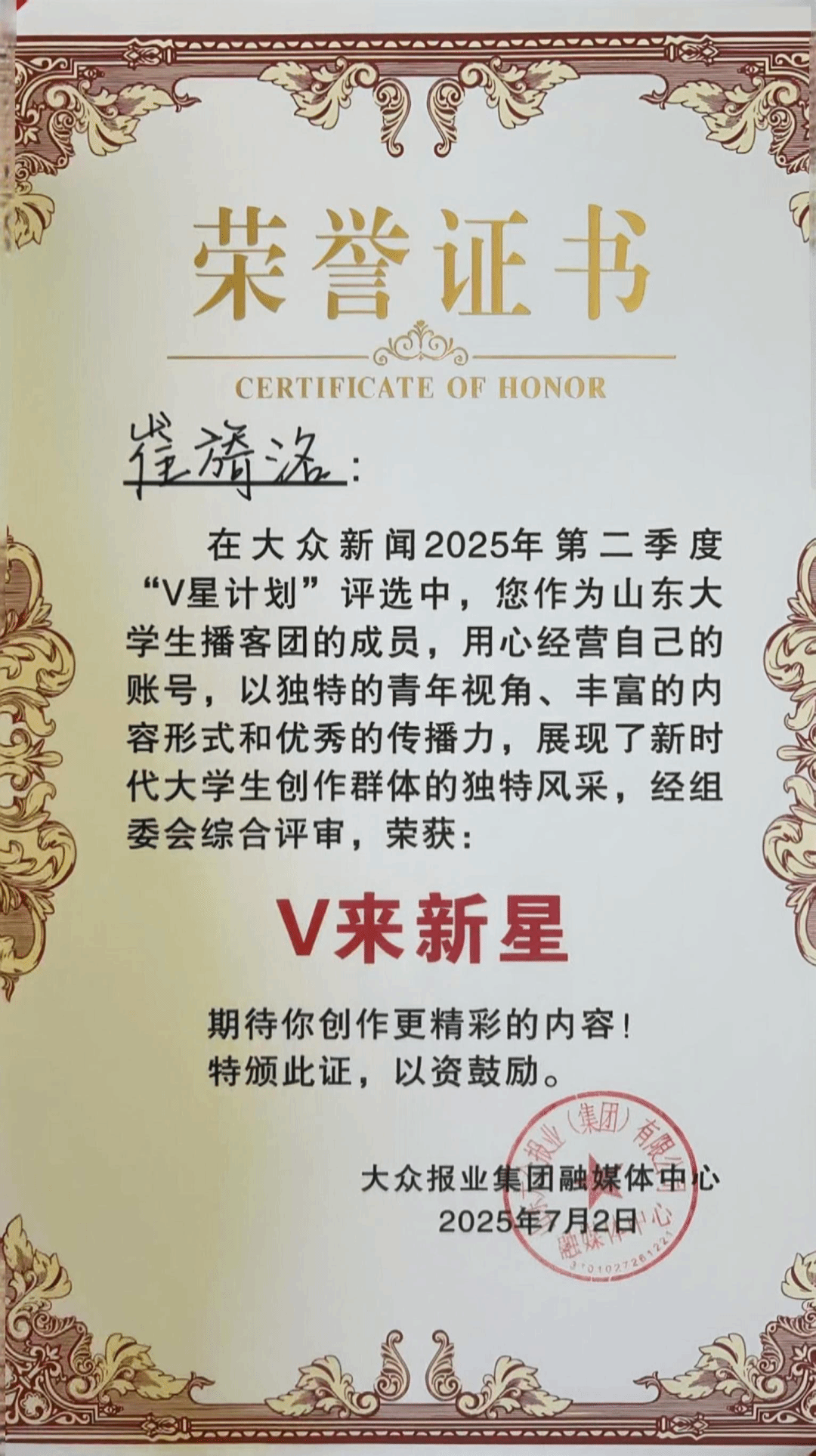 崔旖洺,共青团员,戏曲与曲艺学院2024级戏曲表演班。现任2024级戏曲表演班团支部书记、山东艺术学院校学生会秘书处志愿者。荣获2024“韵动齐鲁”⼭东省体育⽂化艺术活动二等奖、2025⼭东省青少年歌手⼤赛青年戏歌专业组⼀等奖、⼭东地区青春中国•青乐杯青少年音乐成果展演活动青年A组声乐戏曲专场⼀等奖、⼭东地区2025璀璨中华青少年美育教育成果展金奖、大众新闻2025年第二季度“V星计划”V来新星。
