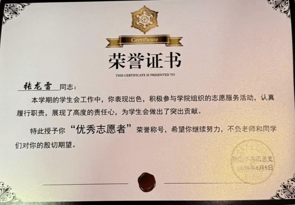 这份“走出课堂、扎根实践”的信念,也延伸到了学院生活里——我主动参与各类志愿服务,从校园环境保护到社区文艺汇演,用舞蹈专业特长传递温暖,连续两学期获评舞蹈学院优秀志愿者。
