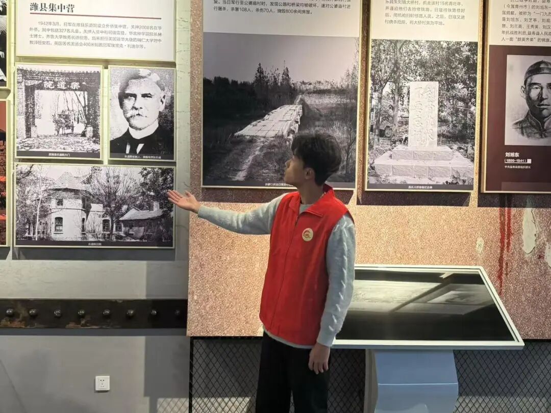 作为青马学员,我总在想:如何让课本里的理论,变成能触达人心的温度?于是,我试着把课堂上学到的红色精神,装进志愿讲解的话筒里——在潍坊市党史馆,我一次次站在展墙前,把那段沉重却滚烫的历史讲给前来参观的青少年听:从集中营的建筑细节,到革命先烈的家书片段,当看到孩子们仰起头认真记录的模样,我忽然懂得了“青马人”的使命:不是把理论背在嘴边,而是把信仰种进更多人的心里。