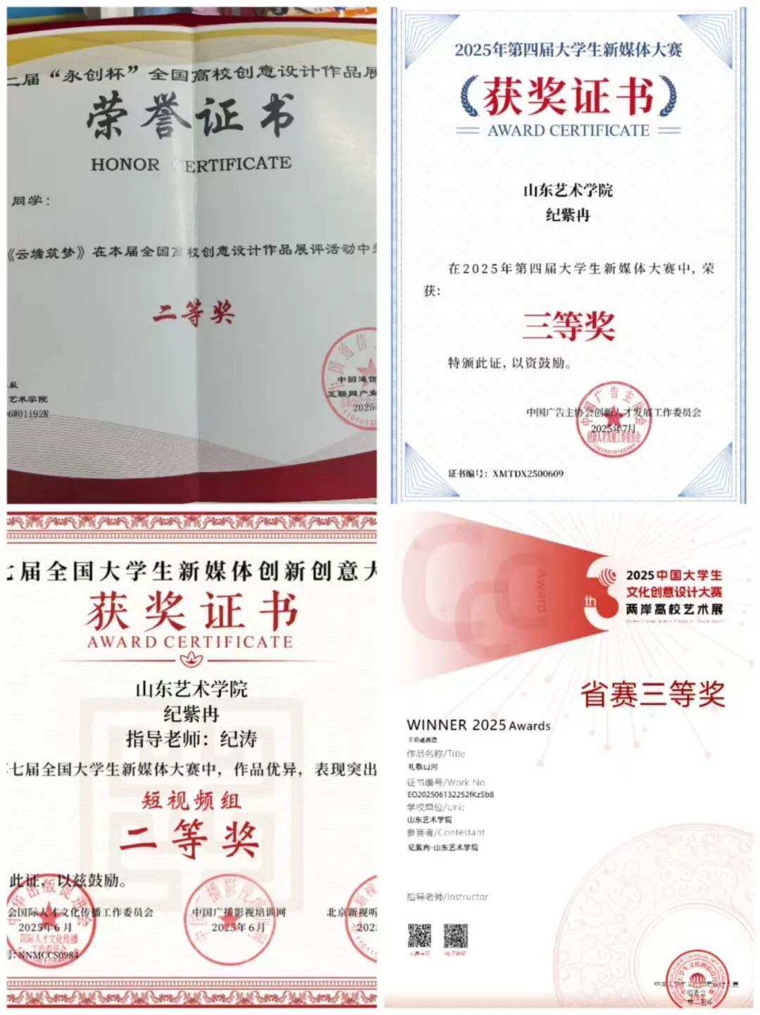 纪紫冉,共青团员,传媒学院2024级广播电视编导纪录片方向。现任2024级广播电视编导一班团支部书记、传媒学院志愿团干事、国旗护卫队队员。荣获2025年“国青杯”全国高校艺术设计作品展评三等奖 、2025年第四届大学生新媒体大赛三等奖、第二届"永创杯"全国高校创意设计作品展评三等奖、第七届全国大学生新媒体创新创意大赛二等奖、2025中国大学生文化创意设计大赛两岸高校艺术展三等奖。