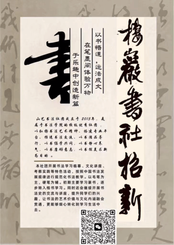 山艺栖岩书社是经校团委审批后成立,由书法学院老师指导开展日常活动,秉持以书悟道,运法成文的宗旨。在笔墨间体验万物,于乐趣中创造书法新篇。