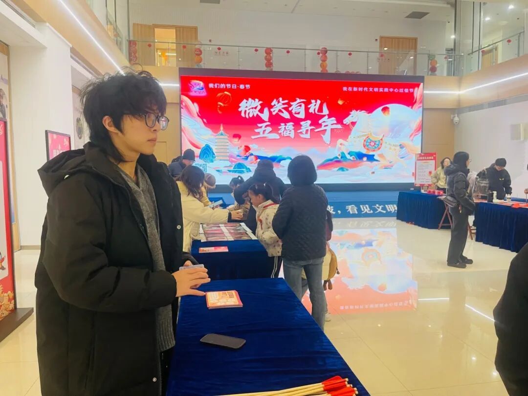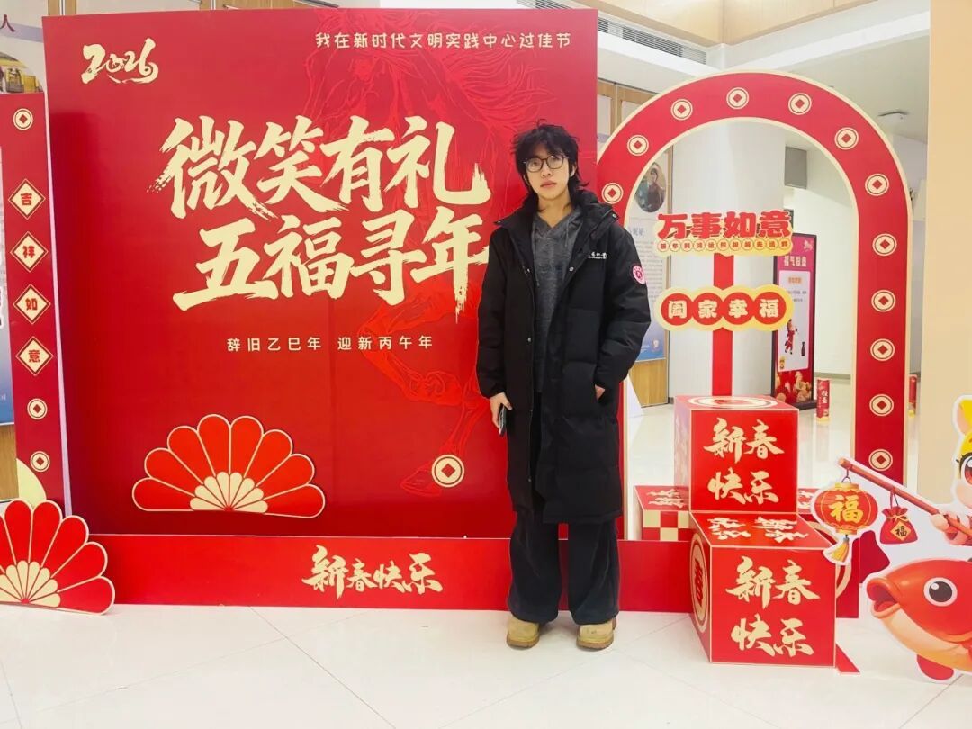 作为美术学院2025级绘画专业学生,寒假返乡期间,我主动在浙江宁波镇海区新时代文明实践中心“微笑有礼,五福寻年”新春游园活动中担任志愿者,以实际行动服务家乡,展现山艺学子的责任与风采,搭建起跨省文化交流的桥梁。
