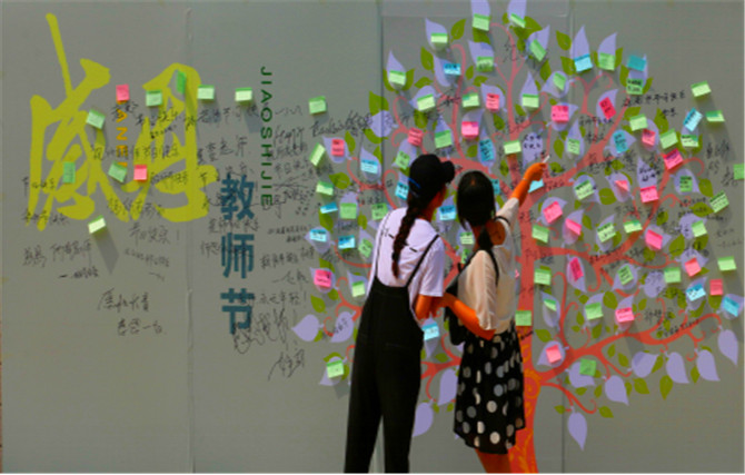 本届“感恩教师节”活动主题明确,形式新颖,吸引了众多师生参加,现场气氛热烈。同学们一笔一画用心把对老师暖暖的祝福与敬意写在便利贴并张贴在背景墙上,阳光下五颜六色的便利贴在山艺绚丽的秋色中飘舞,温暖了老师们的心。老师们也通过此次活动对同学们传达了关心与爱,院长张志民在便利贴上写道,“希望同学们象鲜花一样开的更美丽”。在食堂前广场“感恩教师节”活动的展览板上,同学们纷纷签字留名,为老师送上最虔诚最真挚的祝福。“师者,传道授业解惑也,老师不仅教给我们专业知识和技能,还教给我们做人的道理、处事的方法,老师是我们的成长路上的领航人。吾爱吾师,祝老师们节日快乐!”美术学院学生马先艳如是说。据悉,校学生会、研究生会还精心制作祝福视频并利用微信平台向全校教师祝福,组织学生通过上课起立向老师致敬、向老师献花,向全校学子发出倡议等多种形式,向全校教师表达敬意。