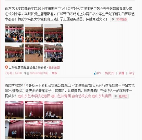 通过为期两天的暑期“三下乡”社会实践活动,同学们利用自己的专业特长为郓城一中和我校“第一书记”帮包村送去了艺术享受,为丰富基层群众文化生活、促进农村精神文明建设贡献了自己的力量。同时,同学们在实践中深入地了解了社会、认知了国情、提升了自我,加深了对青春与梦想的理解,激发了同学们立志成才报国的责任感和积极性。本次社会实践活动也使我校舞蹈学院与郓城当地群众建立起了深厚的友谊,增强了我校和舞蹈学院的社会影响力。菏泽郓城电视台对三下乡社会实践活动进行了全程采访报道,舞蹈学院团总支还通过新浪微博、微信平台等团属新媒体进行了微直播。