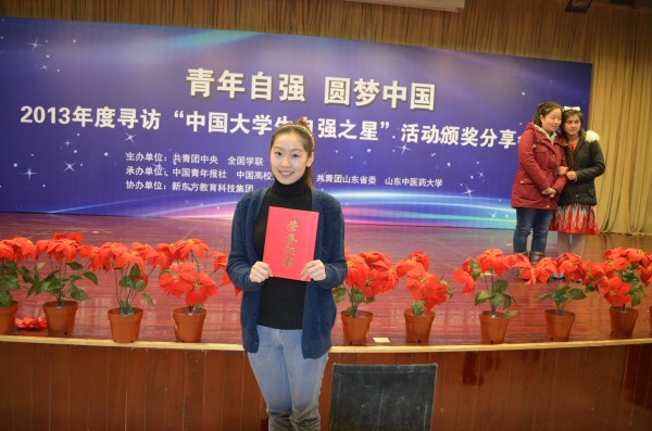 本站讯 2月26日,由团中央和全国学联主办,中国青年报社和中国高校传媒联盟承办,新东方教育科技集团协办的2013年度寻访“中国大学生自强之星”活动颁奖分享会在山东中医药大学举行。我校舞蹈学院2011级研究生姜莎莎荣获“中国大学生自强之星”称号,获得5000元“中国大学生新东方自强奖学金”,这也是我校学子首次获此殊荣。