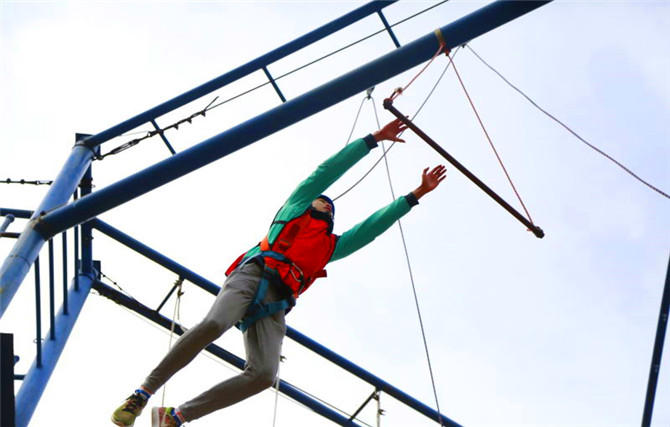 在“高空抓杆”游戏中,所有学员需登上10米的高台,站在直径不足25公分的圆台凌空而跃抓住远在2米外的铁棒,克服心理障碍,战胜心理脆弱就显得尤为重要。“信任背摔”也是一项极具挑战性的游戏,每名参训人员站在高2米的平台上,背对地面坚定地向后倒下,正是来自队友们“准备好了,请相信我们!”的承诺让大家理解了团队中彼此信任的重要性。以及最具挑战性的“空中断桥”游戏,所有同学在有保护的情况下,爬上八米多高断桥,在高空搭建的木板上做两次跨步跳。参与此项目让同学们感受到于“断桥一小步,人生一大步”的突破,每个人都蕴藏着极大的潜能,不尝试永远不知道自己能力,所以在游戏当中,大家互相加油鼓励,只有勇敢的跃出第一步,才能不断超越自我。午饭后,四支队伍还体验了攀登卧虎山的游戏,爬山不仅对于自我是一个挑战,同样也考验了团队之间互帮互助。大家相互加油打气,不让任何一个人掉队,最后一齐登上山顶,真切体验到了"一览众山小”的感觉,欣赏到大自然美好的景象,这是集体带给我们的力量。下午则进行了“建立规划和学会减少不必要时间损耗”的“团队圣塔游戏”,激发了同学们的创新潜能,培养突破自我和团队沟通协作的精神,同时也考验了团队整体的执行能力和时间观念。在训练进行中,队员们时刻以集体为中心,听从队长安排,完成一项又一项的素质挑战,在每个环节中,队员们群策群力,纷纷对环节规则提出自己的解读,积极融入团队,思考如何用最便捷的方法,帮助团队取得胜利,每个成员的价值得到最大限的的体现。