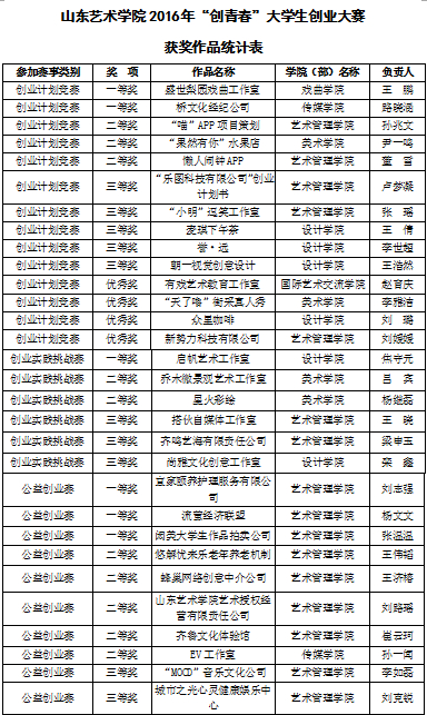 此次比赛,共有40支心怀创业梦想的创业团队分别参加到了“挑战杯”创业计划组、创业实践挑战组、公益创业组的三个组的竞争。创业团队通过PPT汇报展示和答辩环节向评委和同学们展示了自己团队的创业项目与创业计划。传媒学院推荐的桥文化经济公司团队展示了完整的人才推广计划,为毕业生与各大公司企业搭建起了优秀资源共享的桥梁,着力解决毕业生就业难的问题,得到评委的一致好评。国际艺术交流学院的有戏工作室团队选定的创业项目是致力于艺考学生提供个性艺考解决方案,巧妙的构思、完整的方案以及对美好未来的憧憬,给在场的评委和观众留下了深刻的印象。经过激烈角逐,支团队分获“挑战杯”创业计划组、创业实践挑战组、公益创业组一二三等奖,名单后附。各获奖团队将在老师们的指导下参加山东省“创青春”大学生创业大赛。