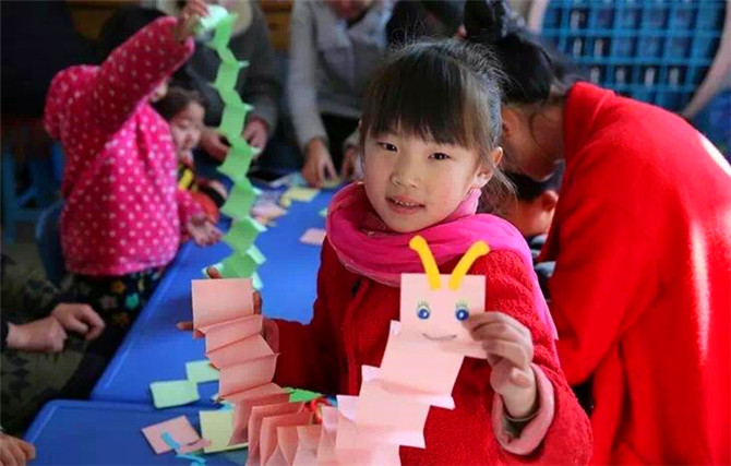 志愿者首先给孩子们上了一堂精彩的手工课。课堂内容丰富,形式新颖,博得孩子们的阵阵掌声,教孩子们叠“小青蛙”、做“纸毛毛虫”,其乐融融,暖意洋洋,在志愿者的引导下,小朋友们很快就掌握了制作要领,做出了一条条栩栩如生的“毛毛虫”和一只只活灵活现的“小青蛙”,幸福和快乐洋溢在小朋友们的小脸上。