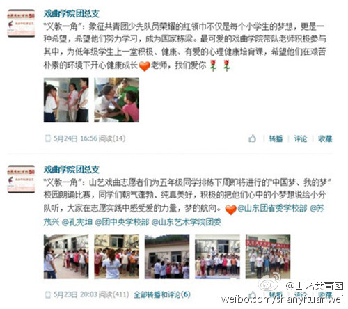 本站讯 5月23日至25日,我校戏曲学院团总支组织大学生志愿者赴崮山小学开展了主题为“爱如茉莉·大手拉小手”的义务支教志愿服务系列活动,受到了小学生们的热烈欢迎和社会各界的高度评价。